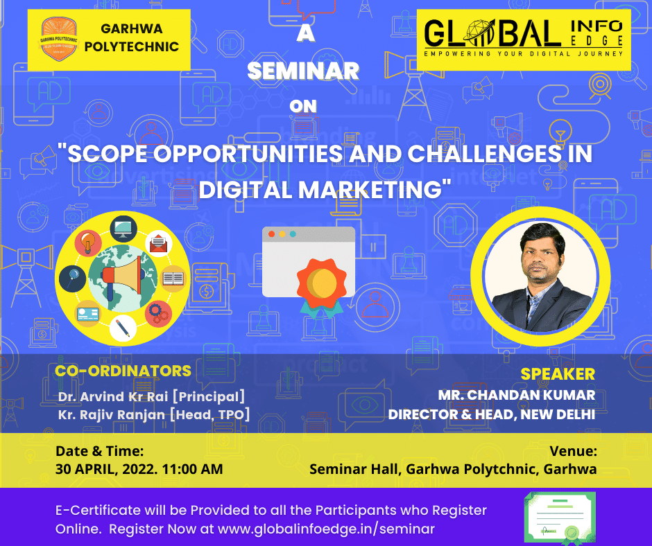 Join Digital Marketing Seminar on 30 April 2022, Going to be held at Garhwa Polytechnic. E-Certificate will be Provided to all the Participants who Register Online.Register Online Now: www.globalinfoedge.in/events